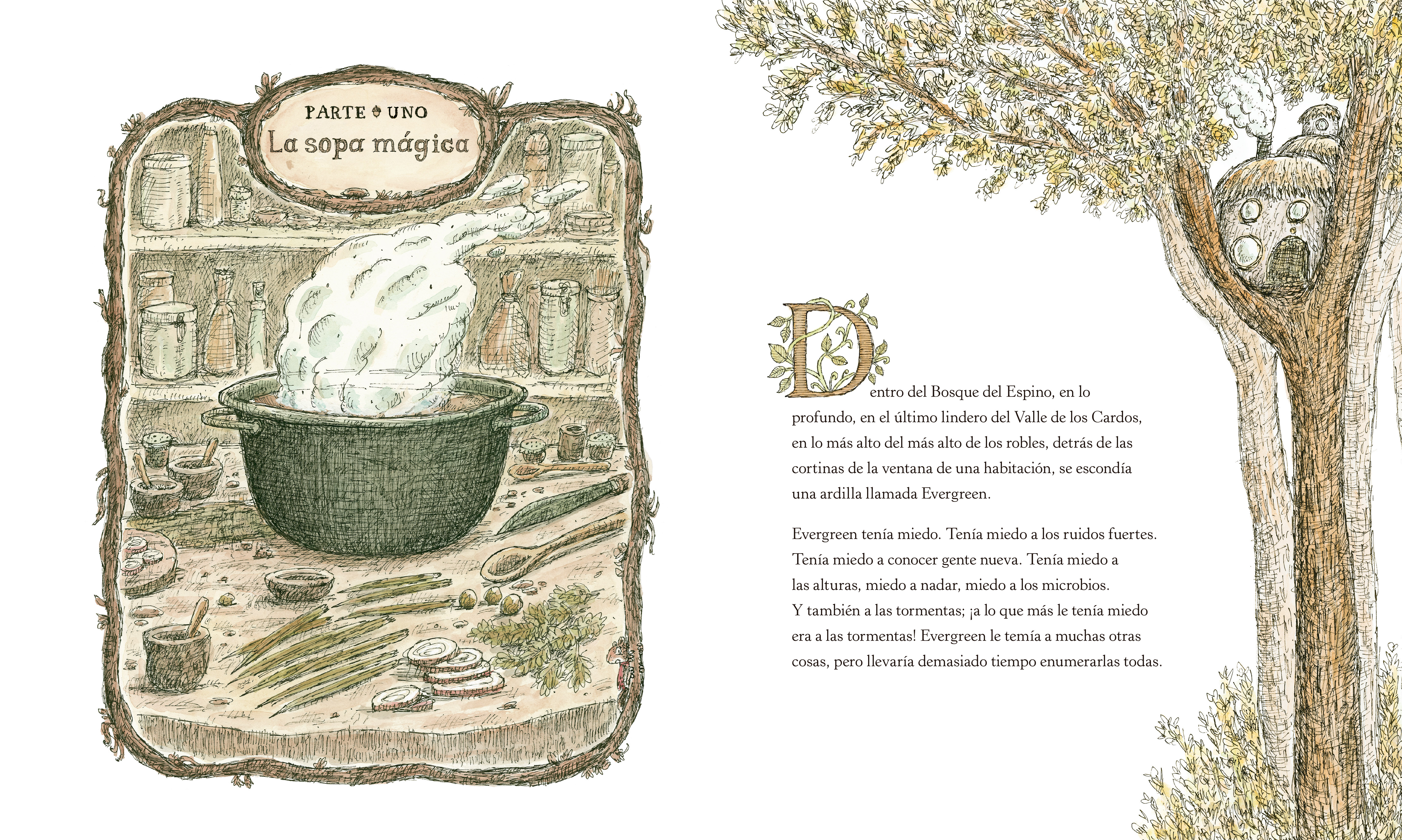 La ardilla Evergreen le tiene miedo a casi todo: a los truenos, a los halcones y a los oscuros senderos del Bosque de los Espinos… Pero cuando su madre le encarga llevarle una sopa mágica a su abuelita Oak, que está enferma de gripe, la ardillita debe enfrentarse a sus miedos y emprender el viaje, con cuidado de no derramar ni una gota, ya que “la abuelita Oak necesitará hasta la última gota para curarse”.
