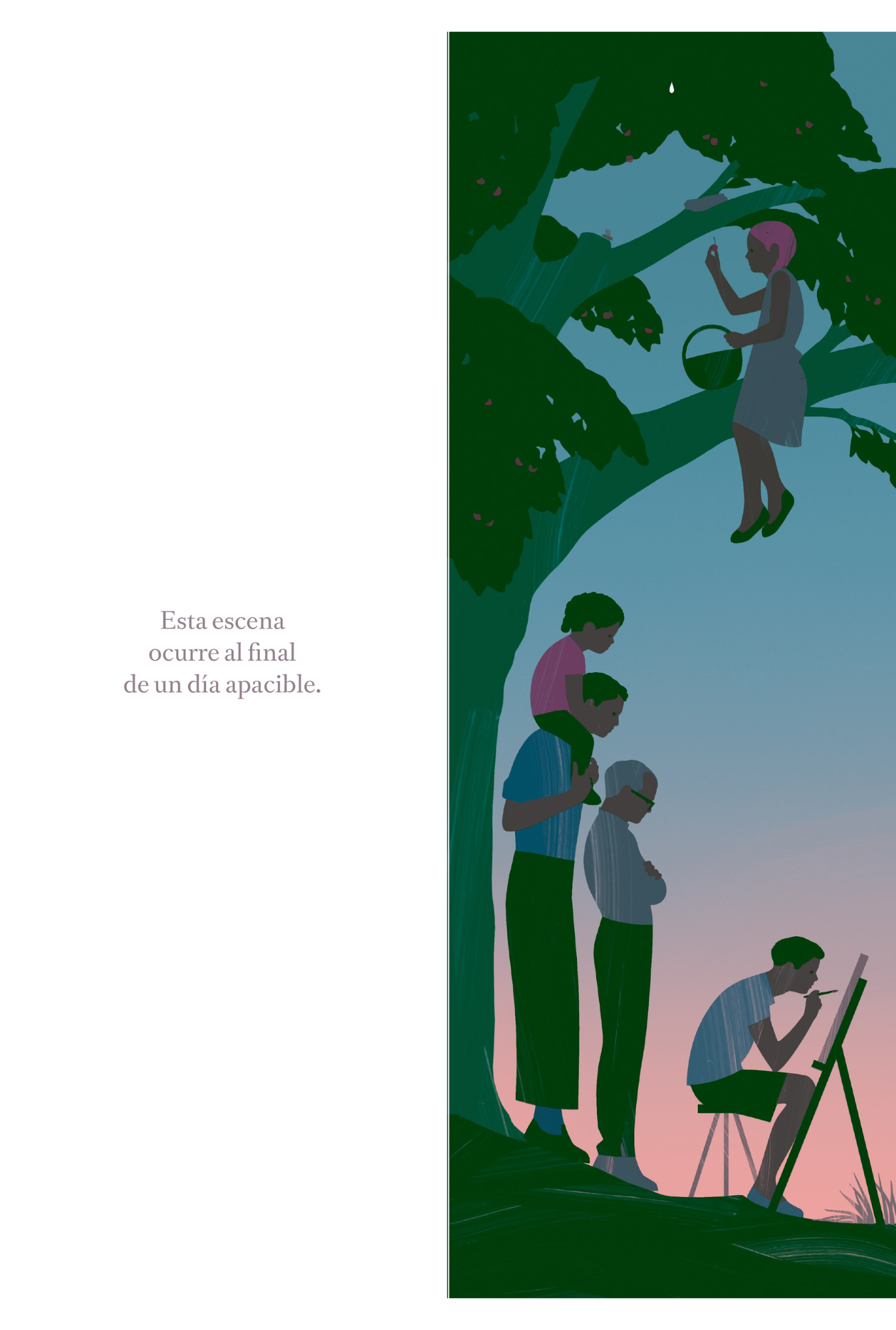 Llega el final de un agradable día en el campo. Un joven pinta un cuadro mientras su familia lo observa. Sobre ellos, sentada en una rama, una niña recoge ciruelas en una canasta. Vemos que una gota de agua cae de las ramas más altas. De pronto aparece una abeja, y somos testigos de cómo, página tras página y en cámara lenta, se reúnen las condiciones para una escena caótica y divertidísima que los lectores querrán ver una y otra vez para descubrir sus muchos detalles.