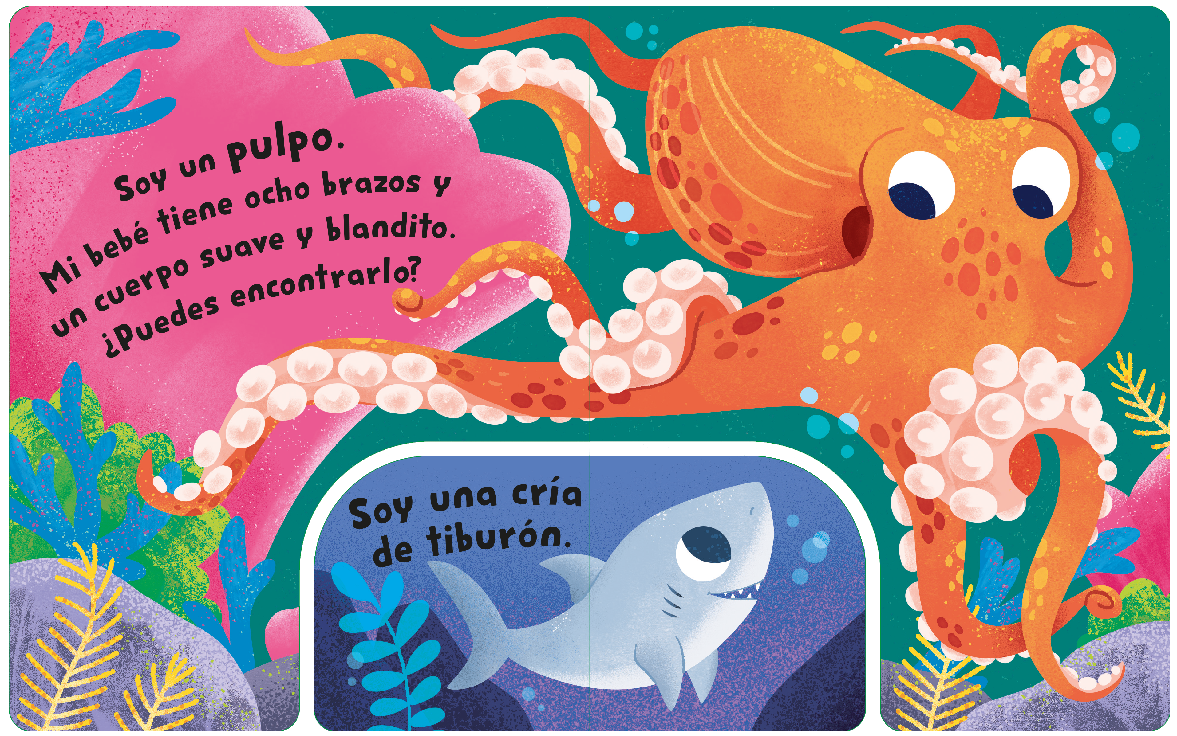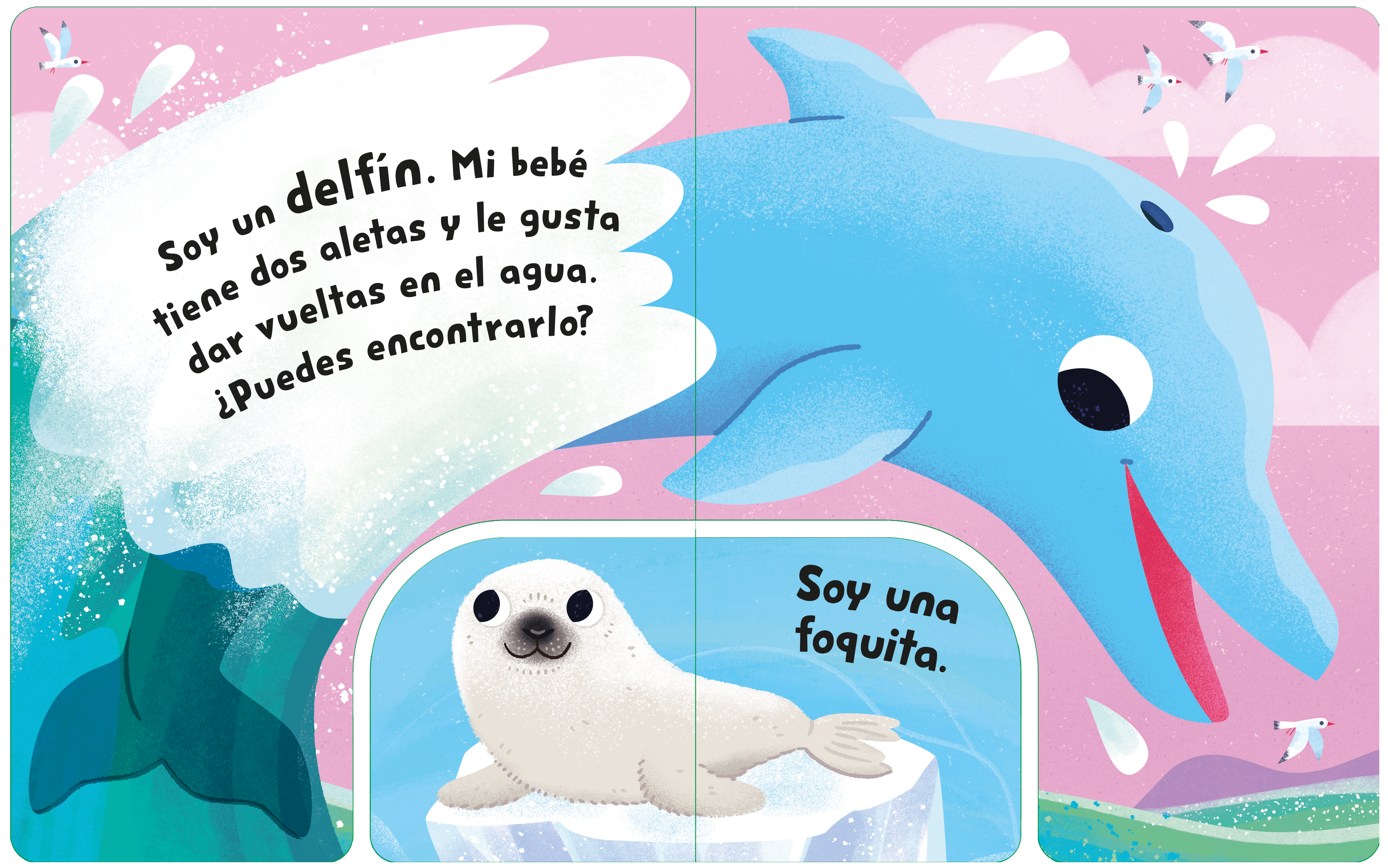 ¡Únete a siete animales del océano y sus bebés en un juego de PARES! Te encantará dar la vuelta a las solapas y encontrar cada pareja.